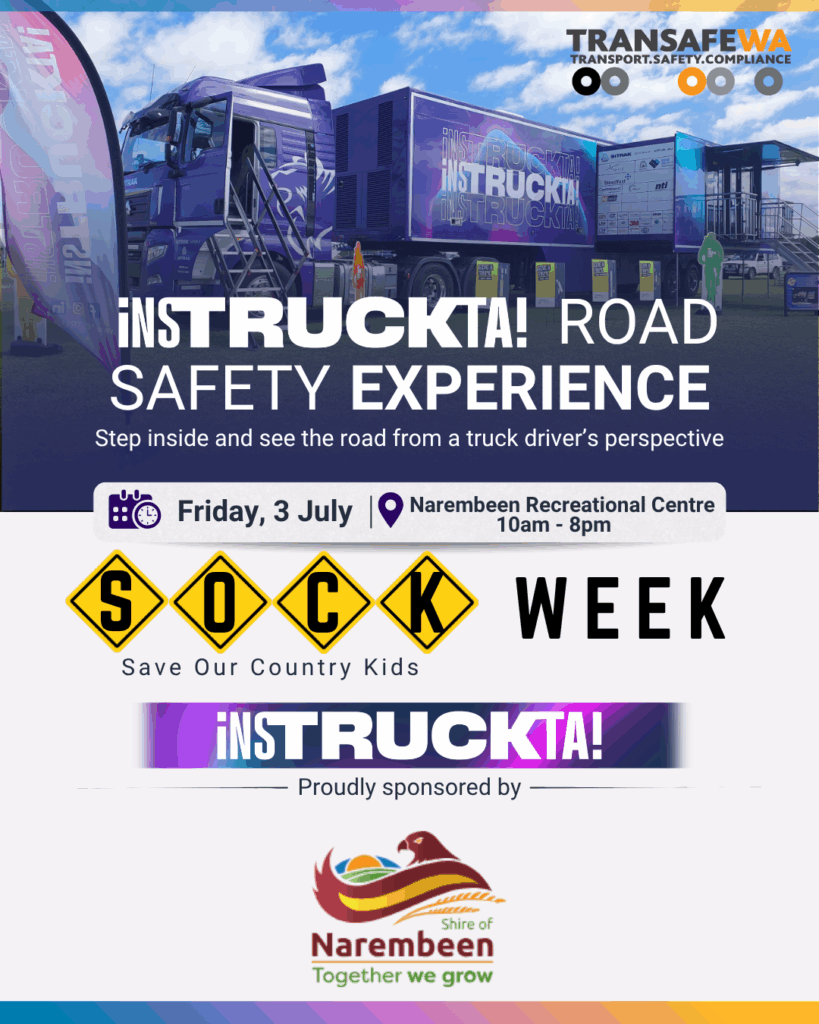 The TRANSAFE WA Safety Truck iNSTRUCKTA! will be in Narembeen on Friday the 3rd of July for S.O.C.K Week 2026.